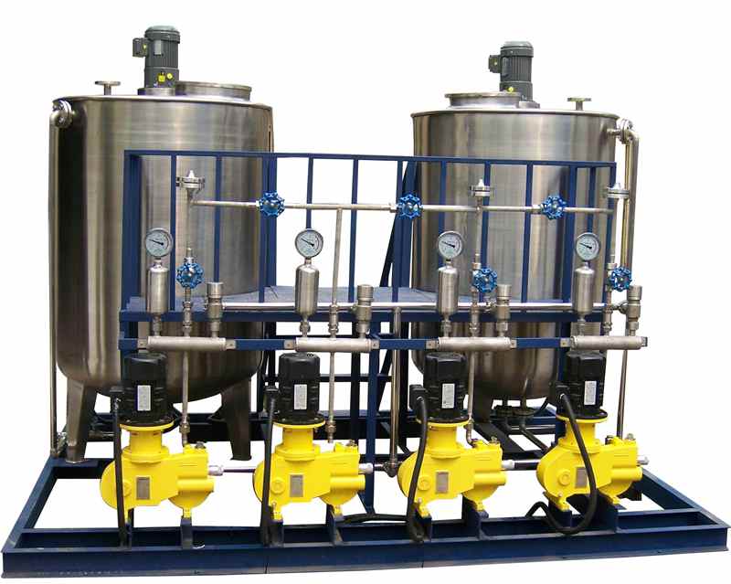 联胺加药装置主要由溶液箱、加氨计量泵、电气控制柜、搅拌机、磁翻板液位计、安全阀、止回阀、流量标定柱、脉冲阻尼器、Y型过滤器、针型阀、球阀、排污阀、压力表、氨雾吸收装置、设备内安装线缆、设备底座及支架平台等组成。氨水由水射器吸入溶液箱,然后按比例加入溶液箱与除盐水或凝结水混合均匀,由计量投加系统投加到锅炉凝结水或给水中。投加控制可采用手动方式,也可依据上位系统输出的控制信号,进行自动投加。
