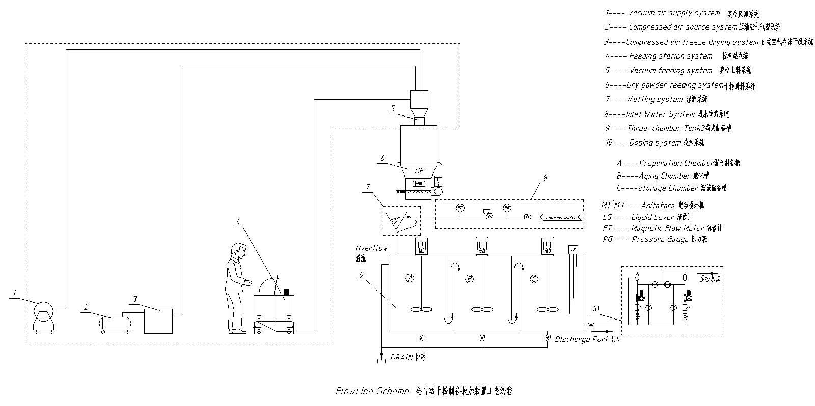 当溶液储备槽C中的液位计LS自动检测低位报警时,打开进水电磁阀进水,启动干粉喂料机自动喂料,启动搅拌机开始按照实际所需浓度配制溶液,待液位计LS自动检测高位报警时,自动关闭进水电磁阀,停止干粉喂料机喂料,待溶液储备槽C溶液用完低液位报警又开始循环以上步骤,实现无人值守全自动干粉制备投加系统。当给料机料斗内物料低料位时,系统现场发出声光报警信号,提醒操作人员需要给料斗补充粉料。方案一,现场操作人员粉料开袋后把物料倒入投料站,真空吸料机自动将物料提升到料斗内。方案二、现场操作人员将吸料机吸料管插入打开的粉料袋内,将袋内的粉料抽到料斗内。真空上料系统在工作过程中,需要用压缩空气间断反复的对过滤网进行反吹,以保障真空上料机能畅通稳定的工作。