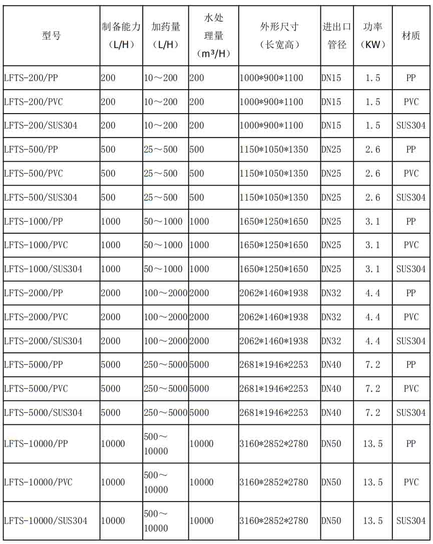 我公司在水处理领域多年的成功经验,经过特别设计和实践检验,开发出专门用于配制、存储和投加粉状及液态物料的系列产品-LFT三槽式干粉配制及投加装置:以絮凝剂、高锰酸钾、活性炭等颗粒物、粉状物或浓缩液为原料,按要求的浓度连续、自动配制,并将配制好的溶液向工业过程连续计量投加。LFT干粉配制及投加装置广泛应用于市政供水和污水,石油、化工、造纸、电力、煤炭、制药和食品等行业的水处理、污水处理及其他工艺介质处理。