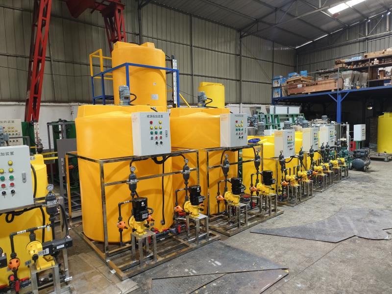 每套加药系统的所有设备及附件应分别安装在一个整体机架上,并设有透明推拉挡板,防止药液泄漏外溅。所有管路、止回阀、安全阀、背压阀、阻尼器、过滤器、校正柱、流量计等附属设备亦应排列整齐安装在其上,并加以固定。
